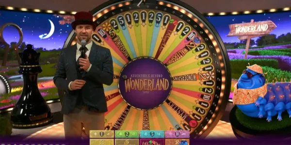 This wheel game looks and feels like Alice in Wonderland crossed with a slightly cheesy game show, in the best possible way. Adventures Beyond Wonderland, hosted on PokerStars, leans into bold colours, oversized props, hosts in full Wonderland character, and augmented reality that makes the studio feel like the storybook has come to life.