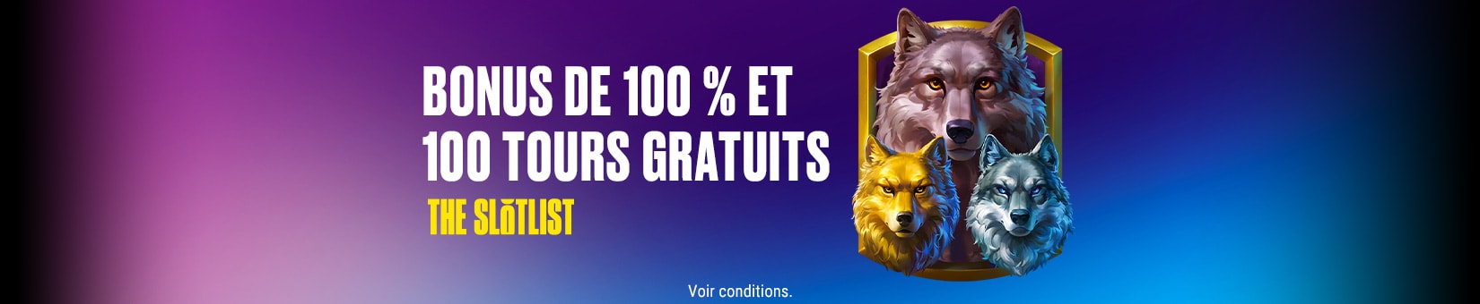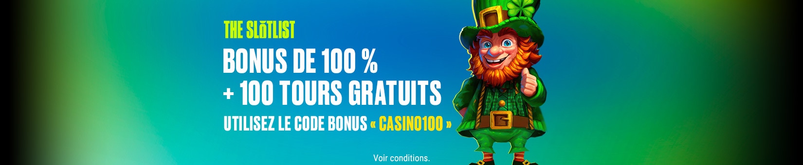 Les nouveaux joueurs du casino peuvent bénéficier d'un bonus de 100 % pouvant aller jusqu'à 100 $ dans le cadre de notre offre Bonus de Premier Dépôt. Ils peuvent également obtenir 100 tours gratuits supplémentaires en accomplissant un Défi Casino, comme indiqué ci-dessous.
