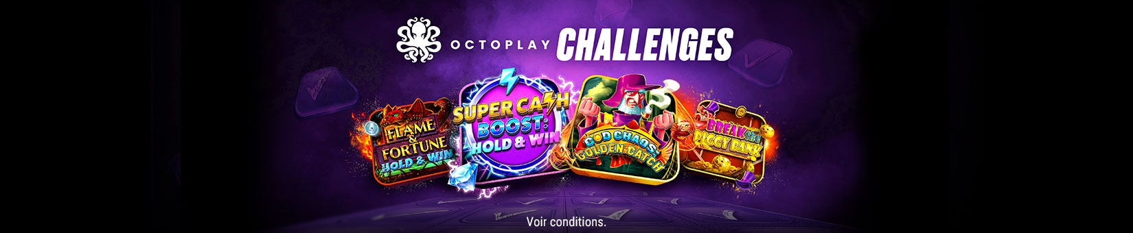 Inscrivez-vous et jouez à quatre machines à sous Octoplay (voir la liste ci-dessous) proposant chacune trois défis. Accomplissez-les dans l'ordre pour remporter un coffre mystère renfermant jusqu'à 1 000 $ en cash.
