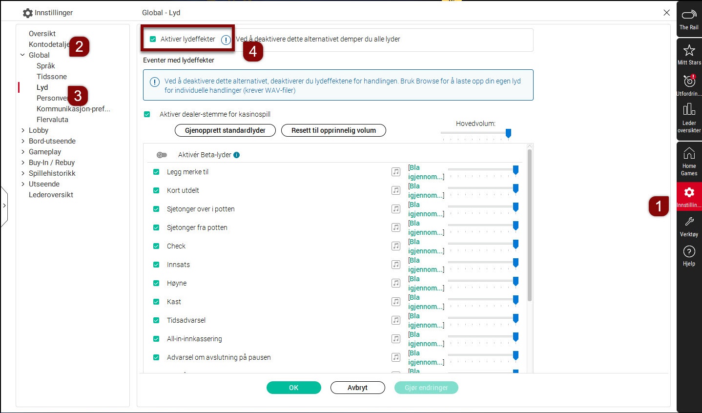 Sjekk at det er krysset av for Aktiver lydeffekter.