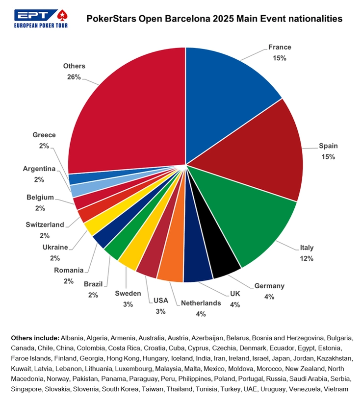 Players came from 85 countries, with France, Spain and Italy the clear top three in terms of player representation. There were 352 players from France (15.4% of the field), 335 from Spain (14.7%) and 274 from Italy (12%).