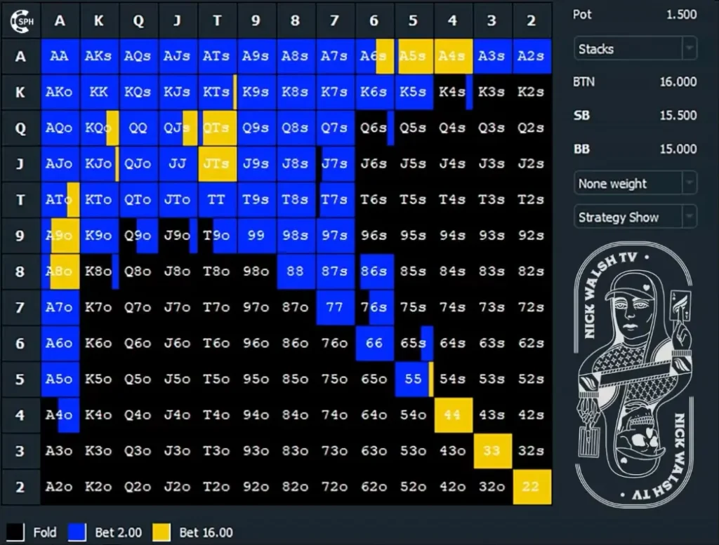 At 16bb effective stacks, you’ll start to see the opening range get tighter for 3h button play. This is because of what we spoke about earlier concerning reshoves. You don’t want to be raise-folding this stack depth too often, or you’ll quickly become exploitable. So, some of the weaker hands are removed compared to the 25bb depth.