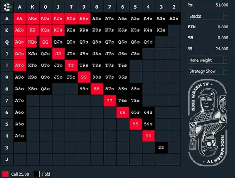 With the basic rules outlined, it’s time to take a look at the first preflop chart for three-handed button play. When a Spin & Go starts, effective stacks will be 25bb, making this the ideal starting point for your studies. This is the stack size for the first hand of the game and until either the blinds go up or stacks shift.